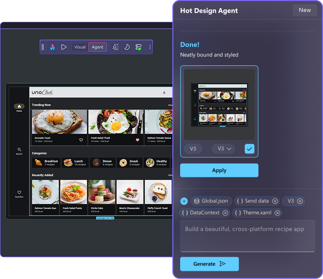 Switch seamlessly between AI agents, Hot Design’s runtime visual designer, and your IDE – you stay in control at every step.